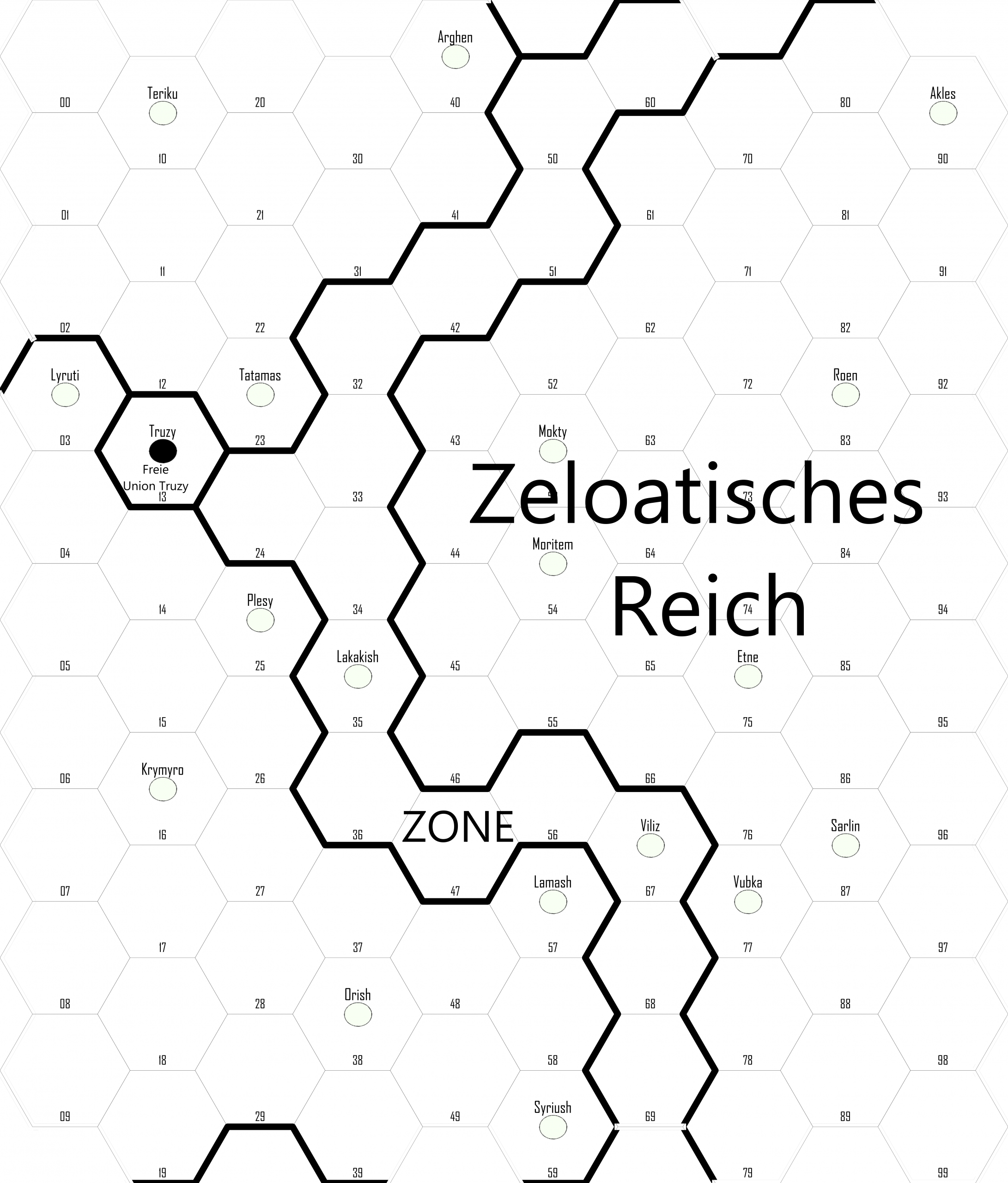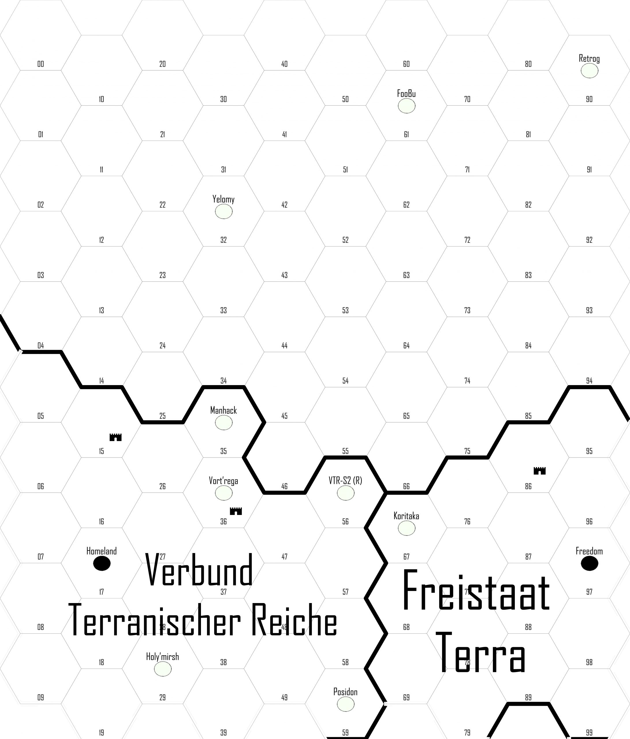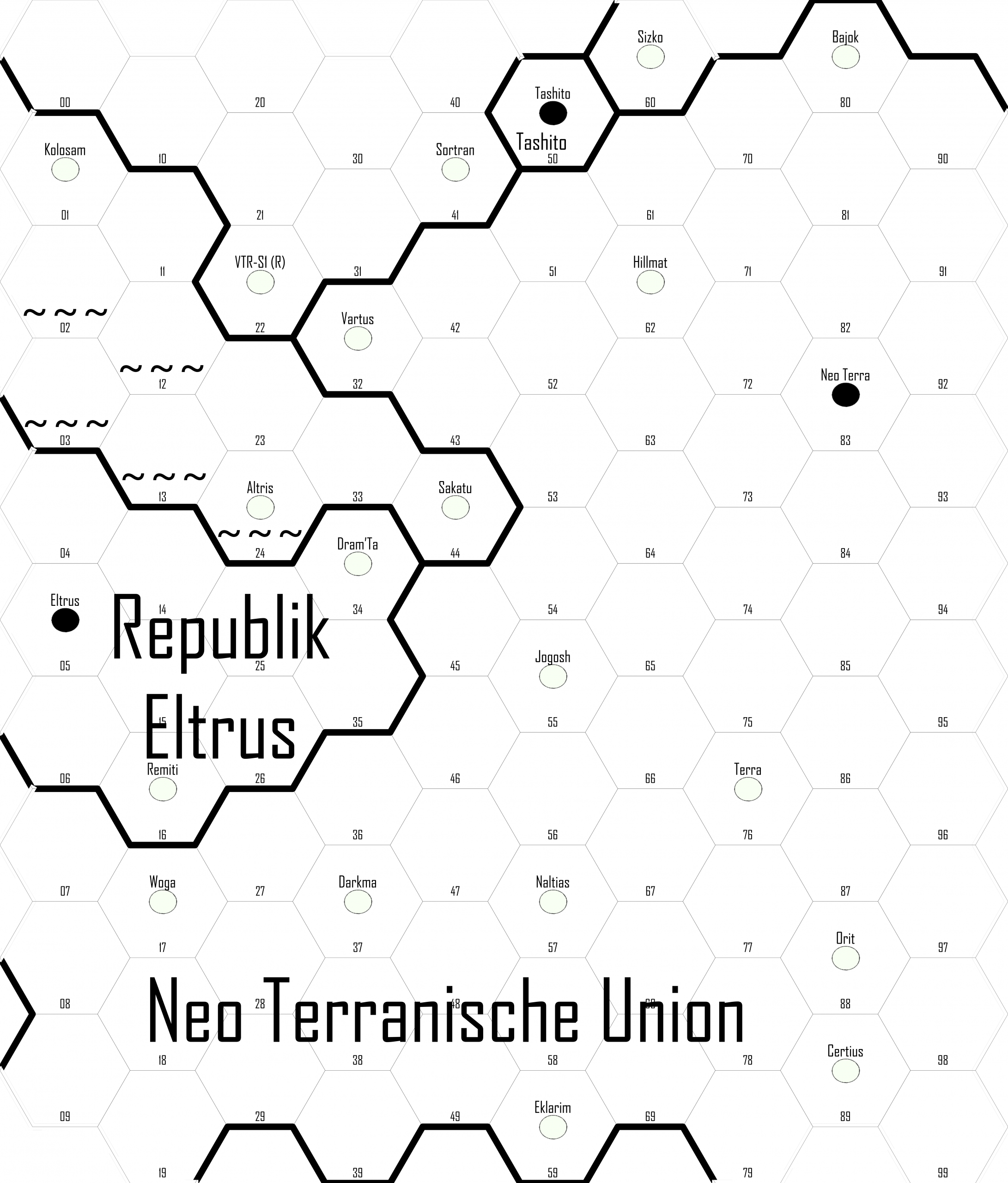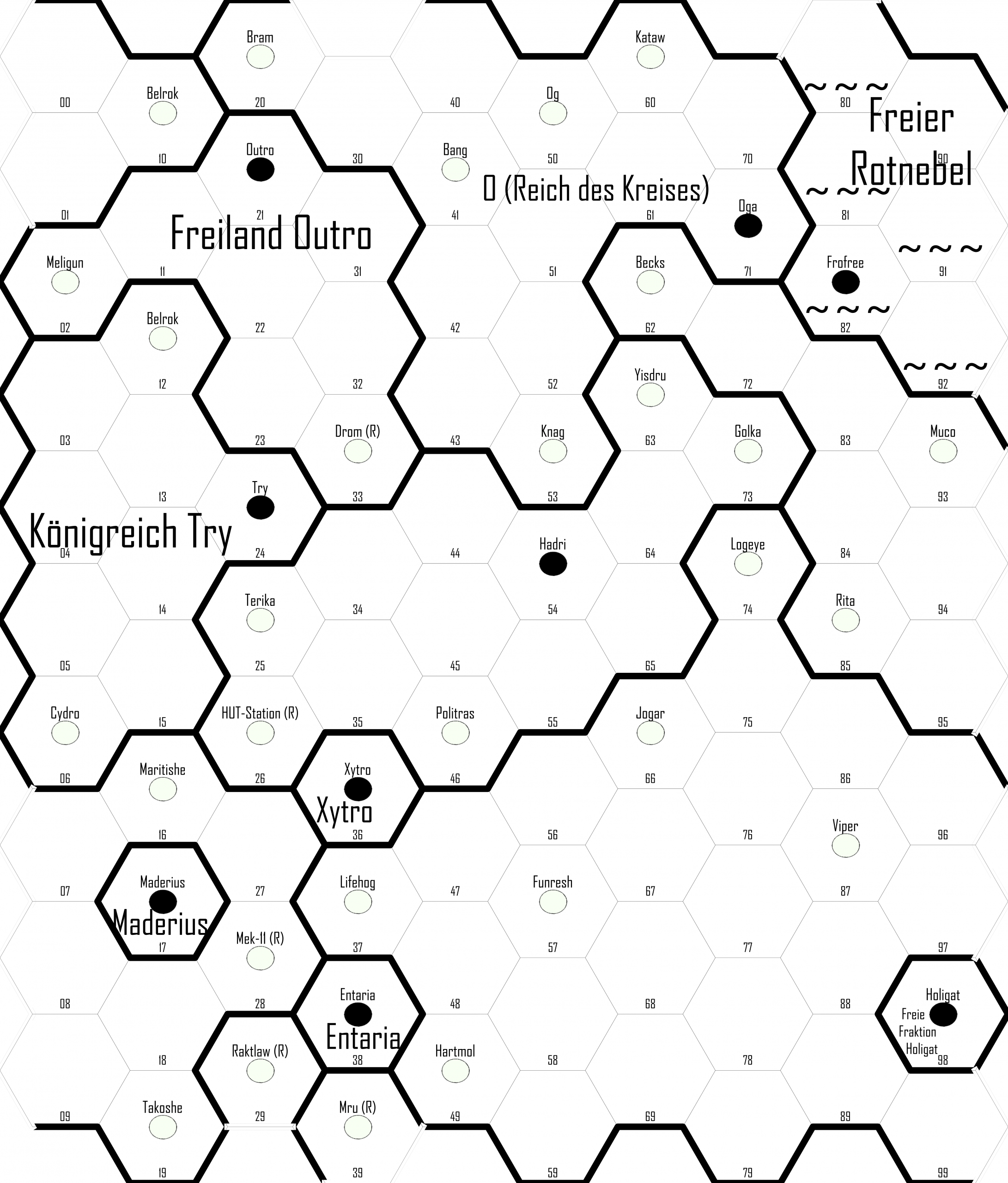- Ein ausgefüllter Kreis stellt ein Sonnensystem dar, das gleichzeitig den Regierungssitz des jeweiligen Reiches darstellt.
