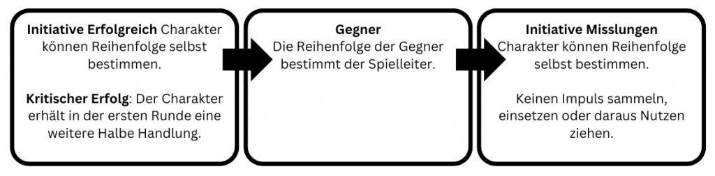 - Gegner: Die Reihenfolge der Gegner wird von der Spielleitung bestimmt. Sind alle Gegner an der Reihe gewesen, sind die Charaktere an der Reihe, die ihren Wurf nicht geschafft haben.