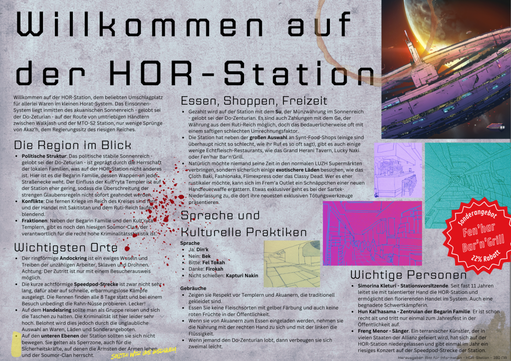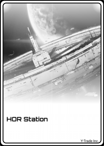 HOR-Station: Die Raumstation liegt im Horat-System und umkreist den lebensfeindlichen Planeten Horat. Das Sonnensystem liegt an einem strategischen Punkt im akuanischem Sonnenreich, der von vielen Händlern angeflogen werden muss. Die Station ist schon sehr alt und ist trotz künstlicher Schwerkrafttechnik ringförmig gebaut worden. Die Station beherbergt über 70 Millionen Lebewesen unterschiedlichster Spezies. Siehe auch die Daten aus dem Planetarischen Atlas. Die Sicherheit an Bord der Station ist sehr streng und mit Ausnahmen flächendeckend. Das verdeckte Tragen einer einhändigen Waffe ist erlaubt, der Service für Raumschiffe ist exzellent und auf der Station können auch exotische Einkaufswünsche erfüllt werden.