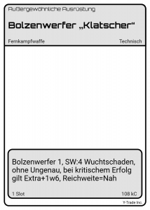 REGEL: Der Bolzenwerfer von Ceni ist eine besondere Waffe. Bolzenwerfer besitzen normalerweise das Attribut Ungenau, was hier nicht der Fall ist. Doch dafür ist die Reichweite der Waffe verringert, sodass sie nicht bei Mittel, sondern nur bei Nah liegt.