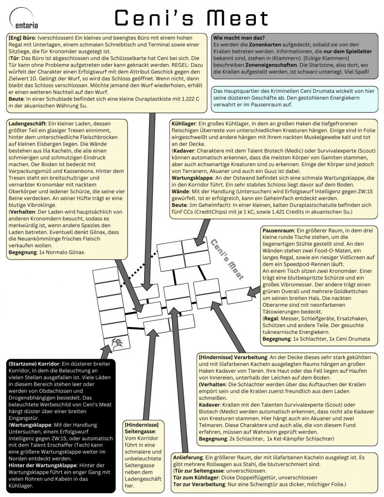 REGEL: Sobald die Charaktere von Ceni’s Meat erfahren haben, kann die Spielleitung die Begegnungskarten für Ceni’s Meat neben der HOR-Station auslegen.